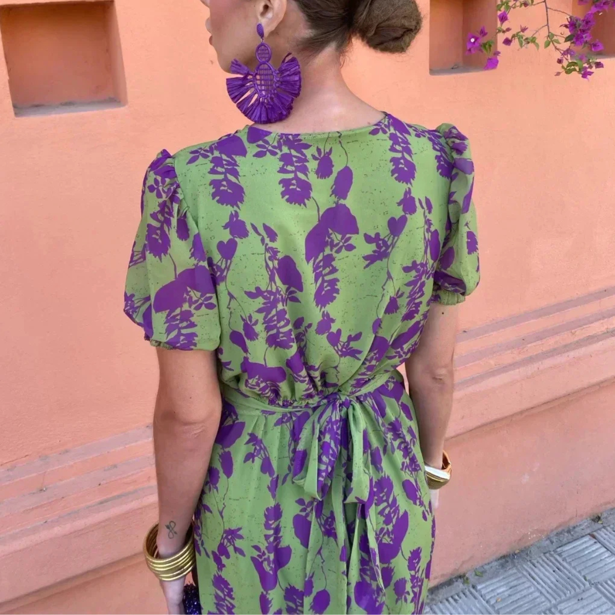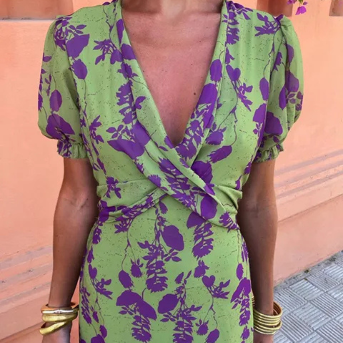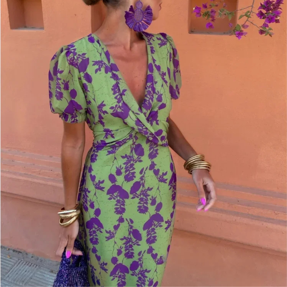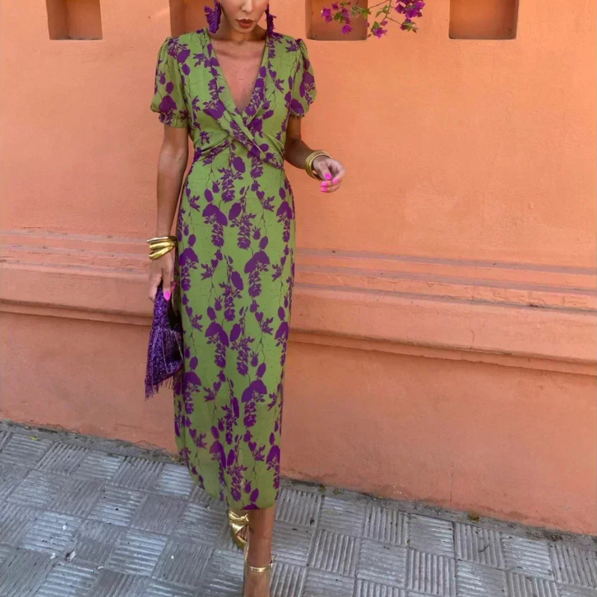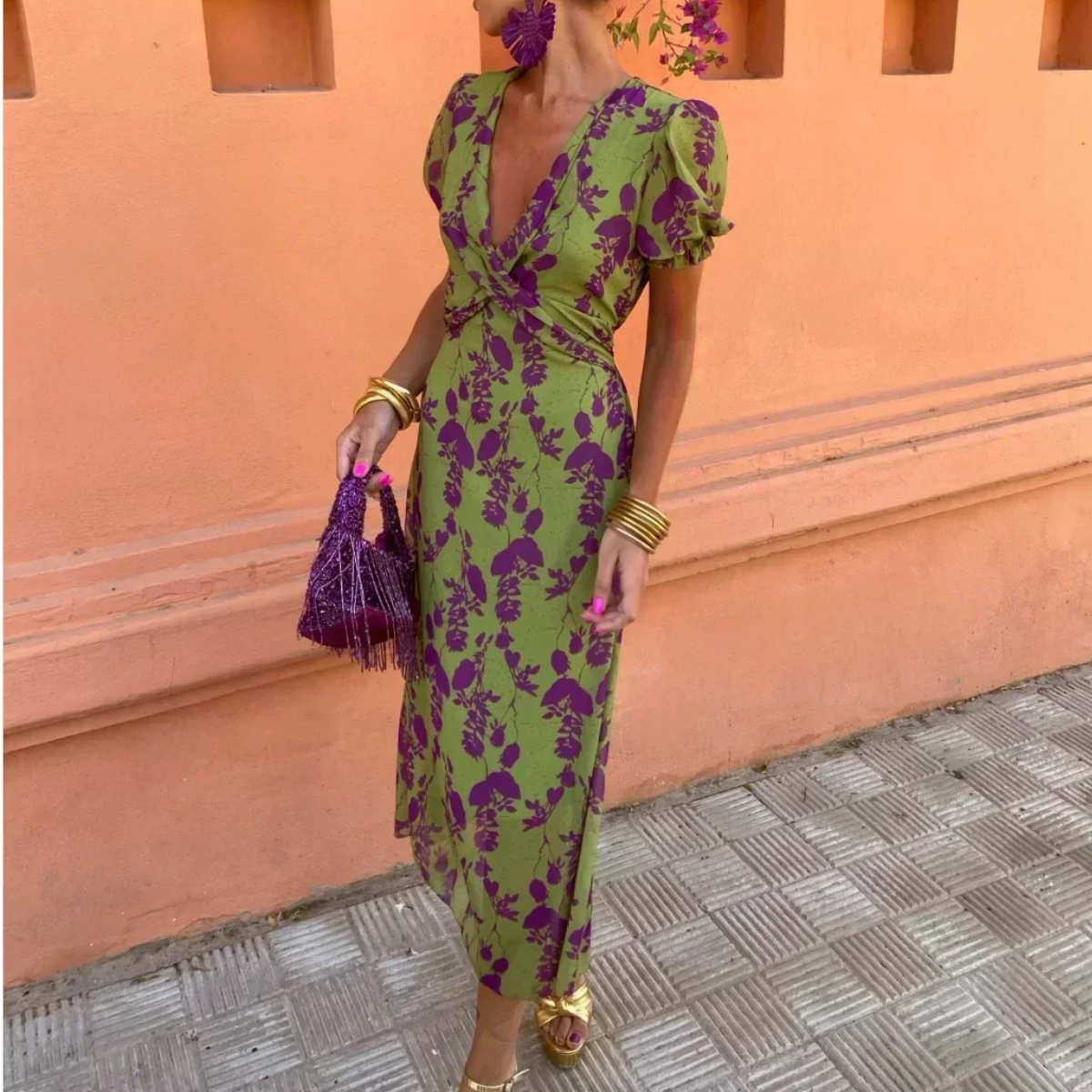 Cette robe d’été à col en V, féminine, fluide et légère, est une pièce Adele™ qui sublime la silhouette grâce à un tissu agréable même sous la chaleur.